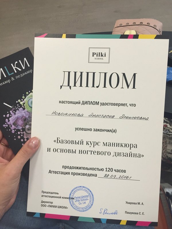 Прежде, чем пойти в школу Пилки, я мониторила много школ. Я человек скрупулёзный, мне важно знать и понимать что мне дадут, за какой срок и стоящее ли это учебное заведение. Школ в Петербурге просто куча (кто занимался поиском грамотной школы, наверное поймут меня. это просто вынос мозга), в общем, сначала я записалась просто на экскурсию, чтобы посмотреть что как есть в школе. В целом, я осталась довольна. Светлые и просторные классы, много учеников и много моделей, рассказали мне все от и до, сходила так же еще в несколько школ и мой выбор остановился все-таки на Пилки. Помимо хорошего, действительно, обучения, где рассказывается все от и до за 3 недели обучения (а не как во многих школах, по 3-5 дней!!!), меня еще устроило, что можно трудоустроиться к ним же в салоны Пилки и кстати, еще вернуть часть суммы за обучения, если я отработаю год, что естественно, меня очень подкупило ( я очень надеюсь, что это правда и я смогу вернуть сумму за обучение). В целом, что могу сказать, программа полная, практики на моделях было много (единственное, один раз осталась без модели, потому что она просто не пришла, но преподаватели вышли из положения), было очень волнительно, когда начали работать аппаратом, потому что я думала, что это куда проще, очень переживала, но все получилось хорошо, хоть изначально были порезы у моделей. В курсе было больше 100 часов(это только маникюр)) в конце сдали экзамен (сдала со второго раза, т к переволновалась на экзамене) и я теперь работаю мастером маникюра в студии Пилки. Я довольна, длительное и качественное обучение, теперь пошла учиться моя подруга по рекомендации. Однозначно рекомендую, были свои косяки, конечно, но без них везде никак.